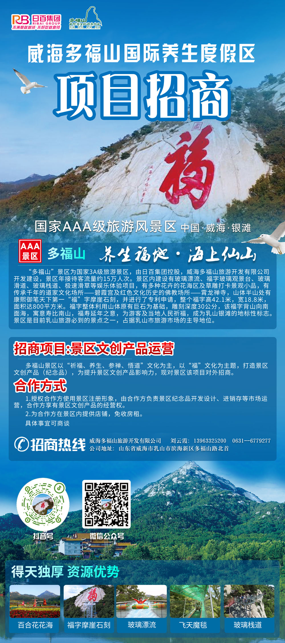 多福山景区距离“天下第一滩”银滩仅有2000米。该项目占地4308亩,拥有乳山市滨海新区的最高峰——多福山(原名嶞崮山),主峰神仙顶海拔395.95米,素以“古刹”、“庙会”、“圣水”、“奇石”而闻名,有着“仙山神宇”和“小泰山”的美誉。其“左青龙、右白虎、前朱雀、后玄武”的风水格局和山巅天然形成的“负阴抱阳”景观极为罕见,令人称绝。景区内谷深涧幽,植被繁茂,被誉为“天然的氧吧”和“度假养生的天堂”,是一座名副其实的海上仙山。由日百集团控股,威海多福山旅游开发有限公司开发建设,威海多福山文旅发展有限公司运营管理。